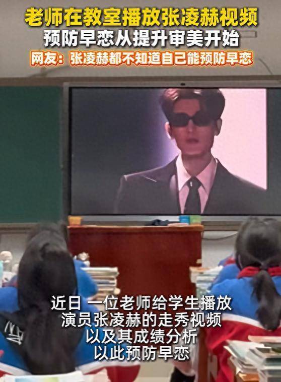 近日,一位老师在教室给学生播放江苏籍演员张凌赫的走秀视频及其成绩分析视频,以此预防学生早恋。网友:又高又帅还是学霸,这下知道啥叫顶配。